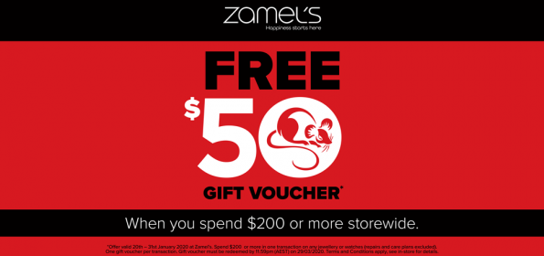 Disclaimer: *Offer valid 20th – 31st January 2020 at Zamel’s. Spend $200 or more in one transaction on any jewellery or watches (repairs and care plans excluded). One gift voucher per transaction. Gift voucher must be redeemed by 11.59pm (AEST) on 29/03/2020. Terms and Conditions apply, see in-store for details.