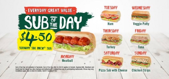 Enjoy everyday great value with Subway's Sub of the Day offer! Purchase a different six inch sub each day for only $4.50. For a limited time only.